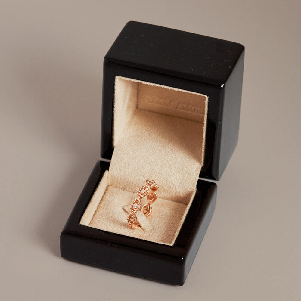 O Anel Florescer reflete a delicadeza da natureza em movimento, com fileiras de diamantes que se alternam em curvas sutis. Inspirado na leveza das pétalas, a peça traduz o conceito de renascimento e beleza contínua, uma expressão do design orgânico e poético de Carla Amorim.