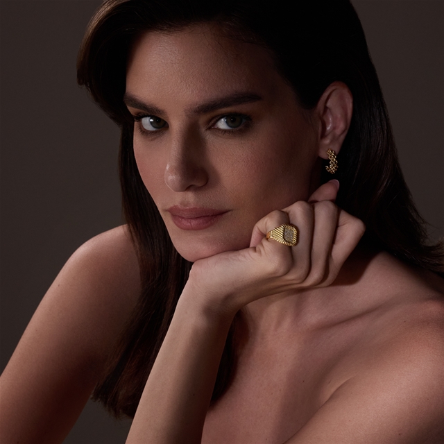 Foto de modelo meramente ilustrativa de como a joia compõe o visual.