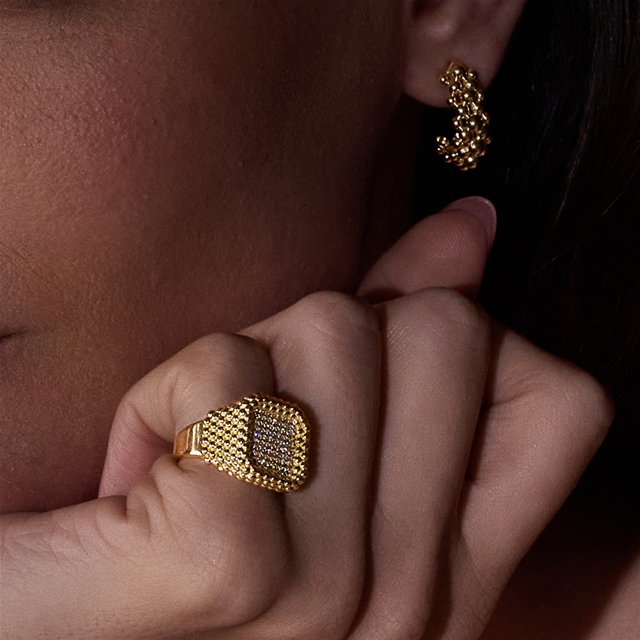 Foto de modelo meramente ilustrativa de como a joia compõe o visual.