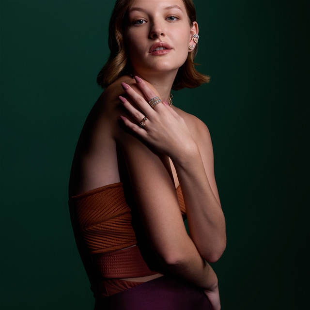 Em ouro 18k, o Anel Sagrados Corações possui movimento e dialoga com outras peças da linha. Uma joia que simboliza fé, conexão e sentimentos em constante transformação.