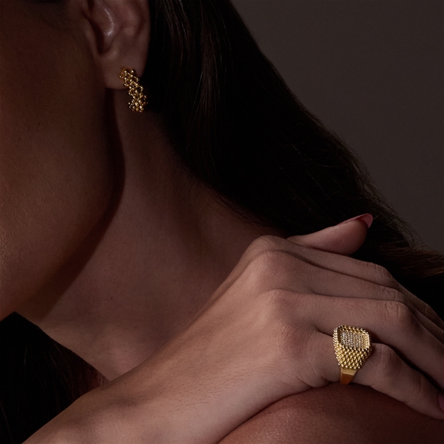 O Piercing Argola Espuma Grossa revela a textura icônica da Espuma do Mar, assinatura da linguagem criativa de Carla Amorim. O volume generoso e a fluidez das curvas criam uma presença escultural que permanece leve, mantendo o equilíbrio natural entre forma e conforto.