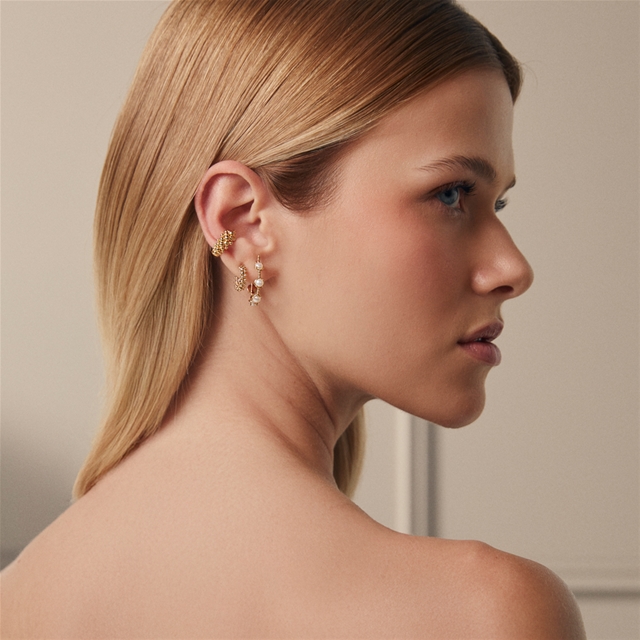 Ouro 18K com pérola natural. Uma joia delicada e atemporal, marcada pela pureza das formas e pela elegância do gesto.