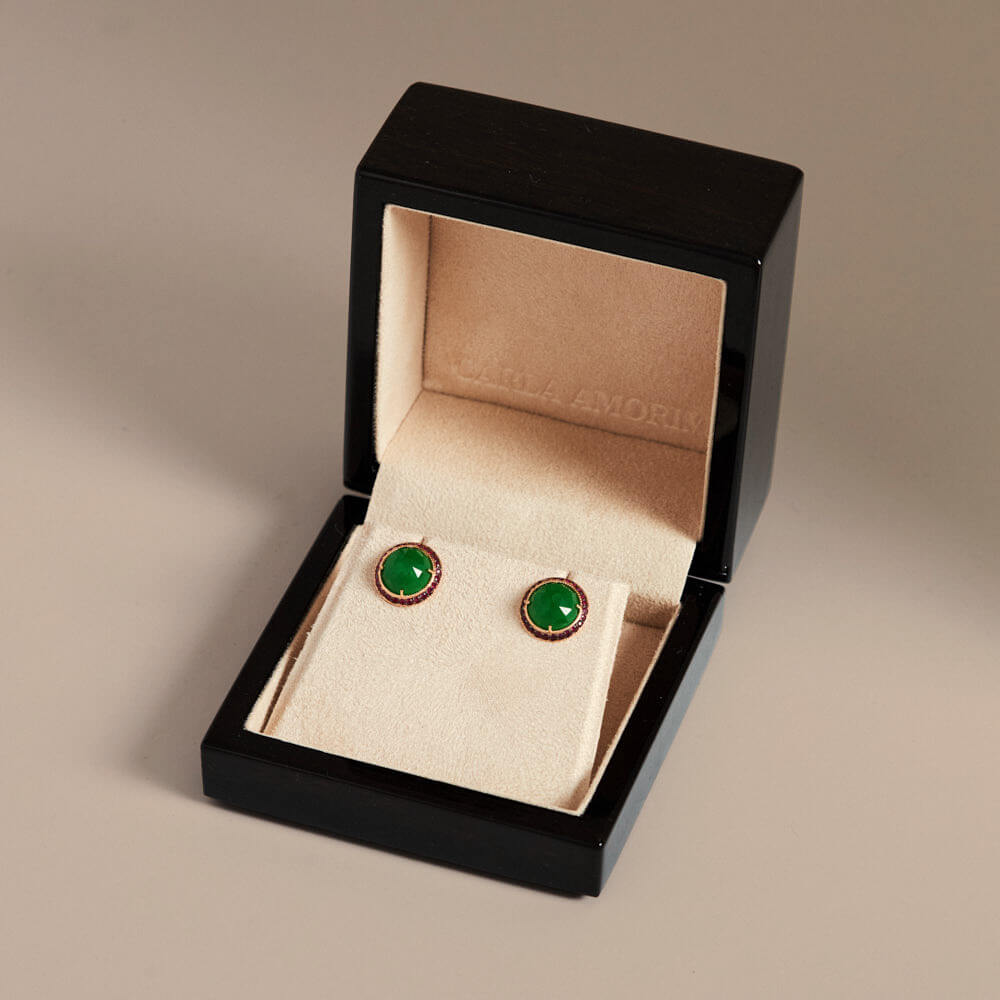 O Brinco Kiwi combina contraste e intensidade em um design de linhas puras. A nefrita verde central é envolta por rubis lapidados, criando um diálogo vibrante entre cor e luz. Uma joia de presença marcante e acabamento primoroso.