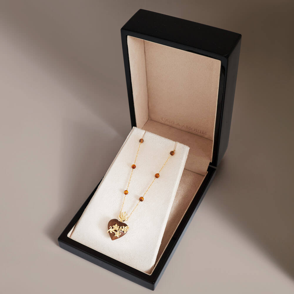 O Colar Água Benta de São José nasce da inspiração no santo conhecido por sua proteção silenciosa e pela força que cuida. A peça combina ouro 18k, olho de tigre e madeira revitalizada da Fundação Almerinda Malaquias, criando um contraste elegante entre natureza e sofisticação. As flores de lírio fazem referência à pureza associada a São José, enquanto o compartimento para água benta, assinatura da Carla Amorim, adiciona um toque íntimo e espiritual. É uma joia que une fé, design e propósito, pensada para quem busca beleza com história.