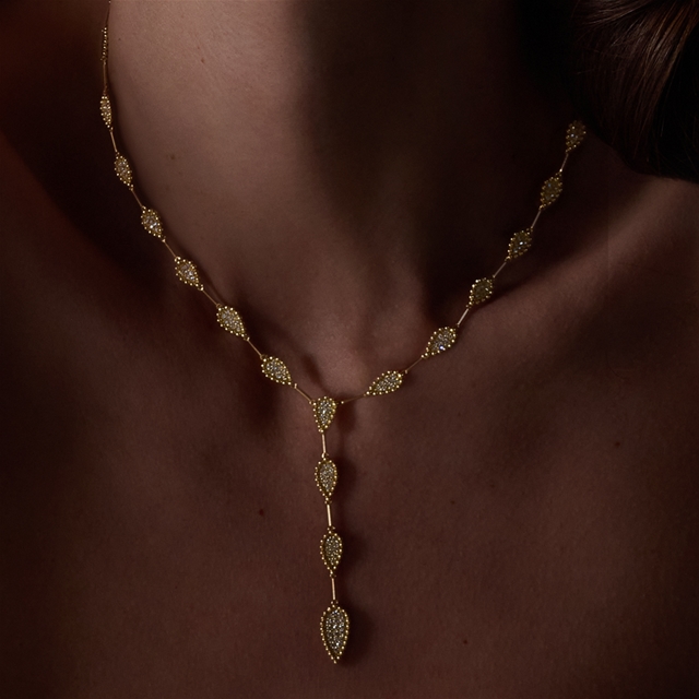 O Colar Gotas de Orvalho, integrante da Coleção Mães, nasce do desejo de celebrar a evolução criativa da marca. A água, entendida como fonte de vida e inspiração essencial para Carla Amorim, orienta cada detalhe da peça. As gotas repousam como símbolos dessa origem: puras, luminosas e cheias de significado. É uma criação original por transformar a essência da natureza em delicadeza contínua, um brilho que parece respirar.