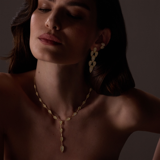 O Colar Gotas de Orvalho, integrante da Coleção Mães, nasce do desejo de celebrar a evolução criativa da marca. A água, entendida como fonte de vida e inspiração essencial para Carla Amorim, orienta cada detalhe da peça. As gotas repousam como símbolos dessa origem: puras, luminosas e cheias de significado. É uma criação original por transformar a essência da natureza em delicadeza contínua, um brilho que parece respirar.