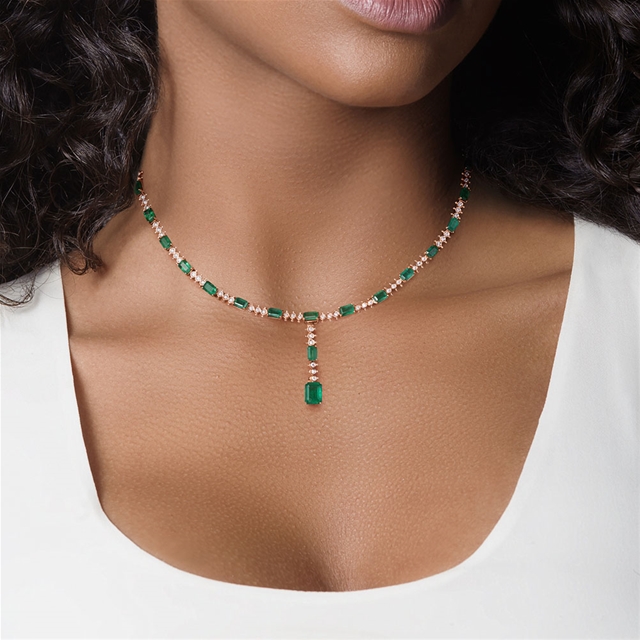 Colar em ouro 18K rosa com esmeralda e brilhantes.