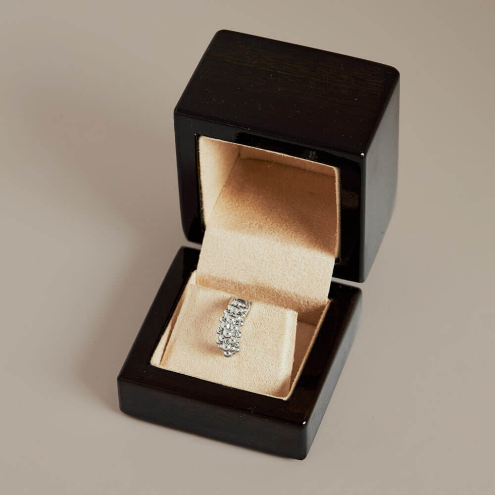 Ouro branco 18K em estrutura maciça que representa a bruma em sua forma mais pura. Uma joia de encaixe preciso, marcada pela atemporalidade do design.