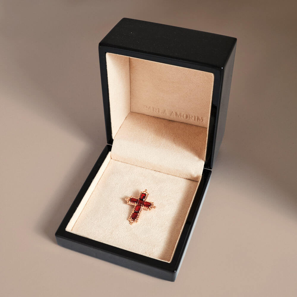 O Pingente Adorável Cruz Granada pertence à coleção Sagrado. Inspirado na simbologia da fé, combina a força das gemas vermelhas ao brilho do ouro em um desenho de presença marcante. As granadas, lapidadas em formatos esmeralda e carré, revelam profundidade e intensidade únicas.