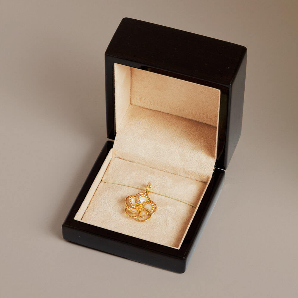 O Pingente Amor Perfeito pertence à coleção Florescer. Inspirado na flor que simboliza amor e lembrança, representa a delicadeza dos sentimentos que permanecem no tempo. O esmalte preto realça o contorno das formas e intensifica o contraste com o ouro.