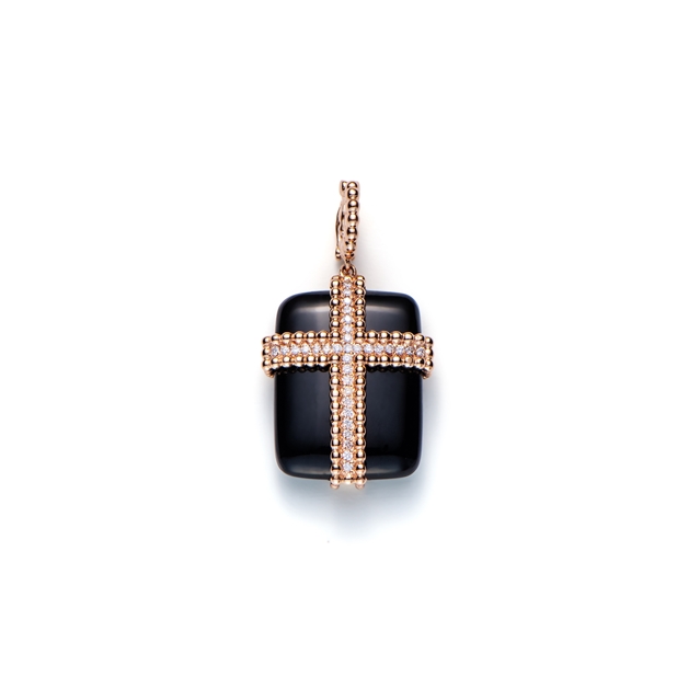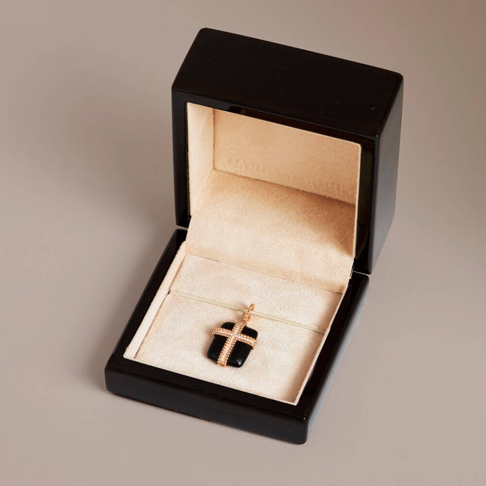O pavê central de diamantes ilumina a cruz, enquanto o ônix acrescenta contraste e profundidade.