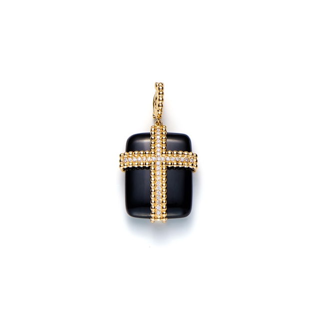 O pavê central de diamantes ilumina a cruz, enquanto o ônix acrescenta contraste e profundidade.