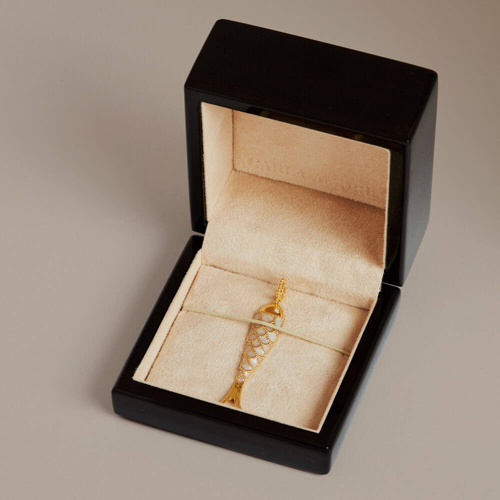 O Pingente Peixe Esmalte Madrepérola revela a delicadeza das águas calmas em contraste com o brilho do ouro e dos diamantes. Sua superfície esmaltada e o acabamento artesanal traduzem a fluidez do mar em uma joia leve, sofisticada e cheia de simbolismo.