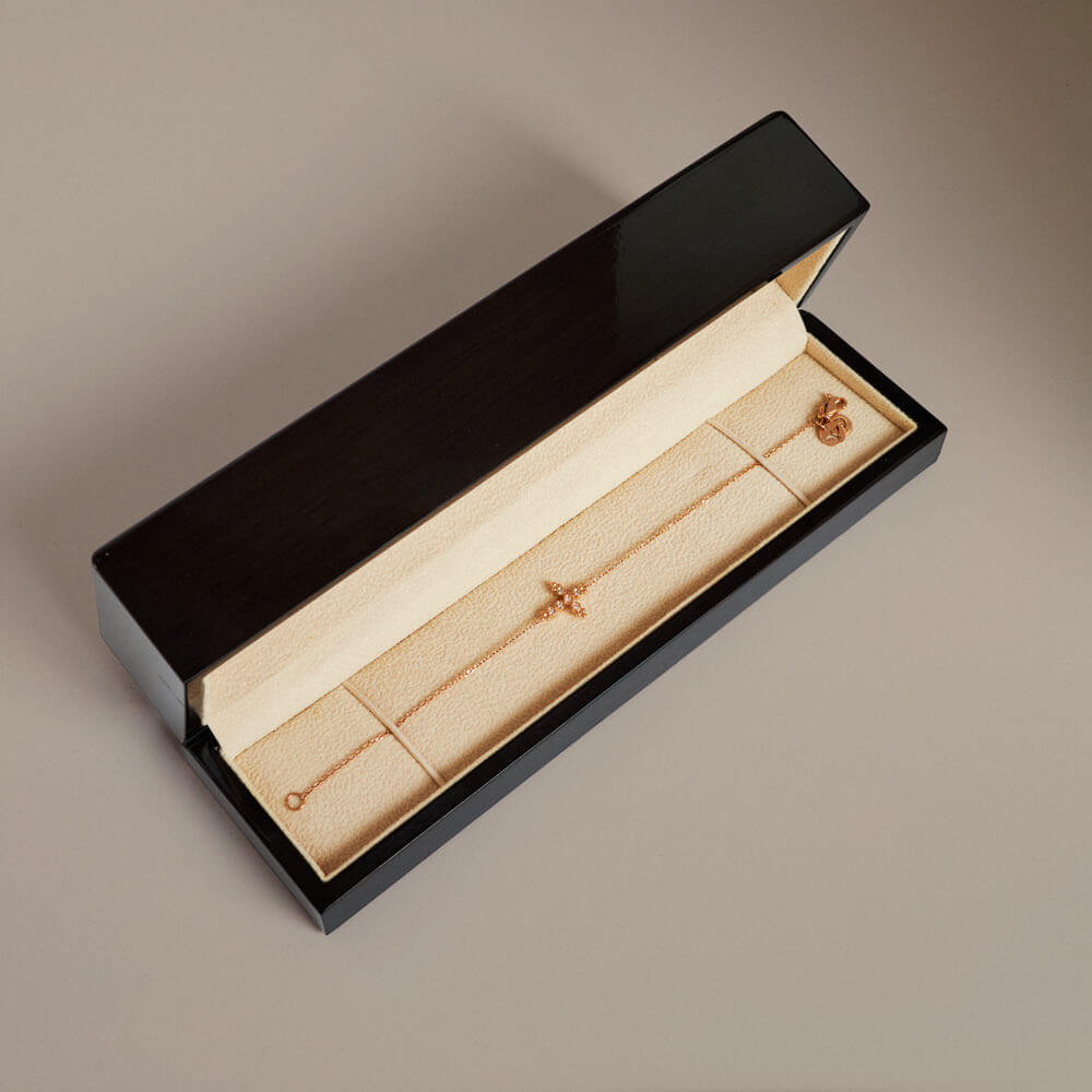 A Pulseira Luz do Céu faz parte da coleção Sagrado. Inspirada na simbologia da cruz, reflete espiritualidade e fé traduzidas em forma de joia. O design limpo e equilibrado ressalta a força do símbolo e o rigor do acabamento.